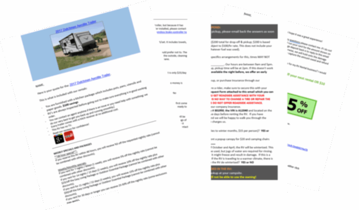 Imagine having templates ready to go for every type of email scenario. Allowing for 10x the sale and conversion rate. With 10 years of expertise honing and writing the perfect responses to any customer’s requests. This will include, quotes, questionnaires, reservations, post returns, and even getting reviews. Customer Email Templates come ready to go in a word document for fully customization for your RV or fleet.